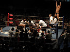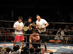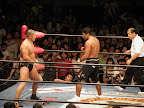 中盤、張り手の応酬から、船木がいわゆるプロレス的な技を出し始める。ツームストン、浴びせ蹴り、トップロープからのミサイルキックはジャンプも十分で素晴らしかったねえ。だいぶ慣れてきたのかな。