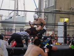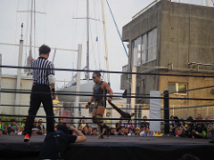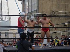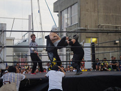 会場は「(社)横浜ヨット協会横 特設会場」。ヨットハーバーと倉庫の間の敷地で、海と直結! 敷地が坂になってるので水平にするためリング下には板が重ねられている。