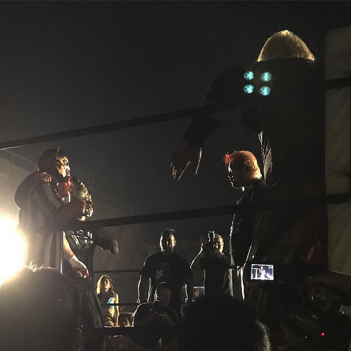 KIYOSHIと青木と大仁田がそれぞれ毒霧をやっていた。