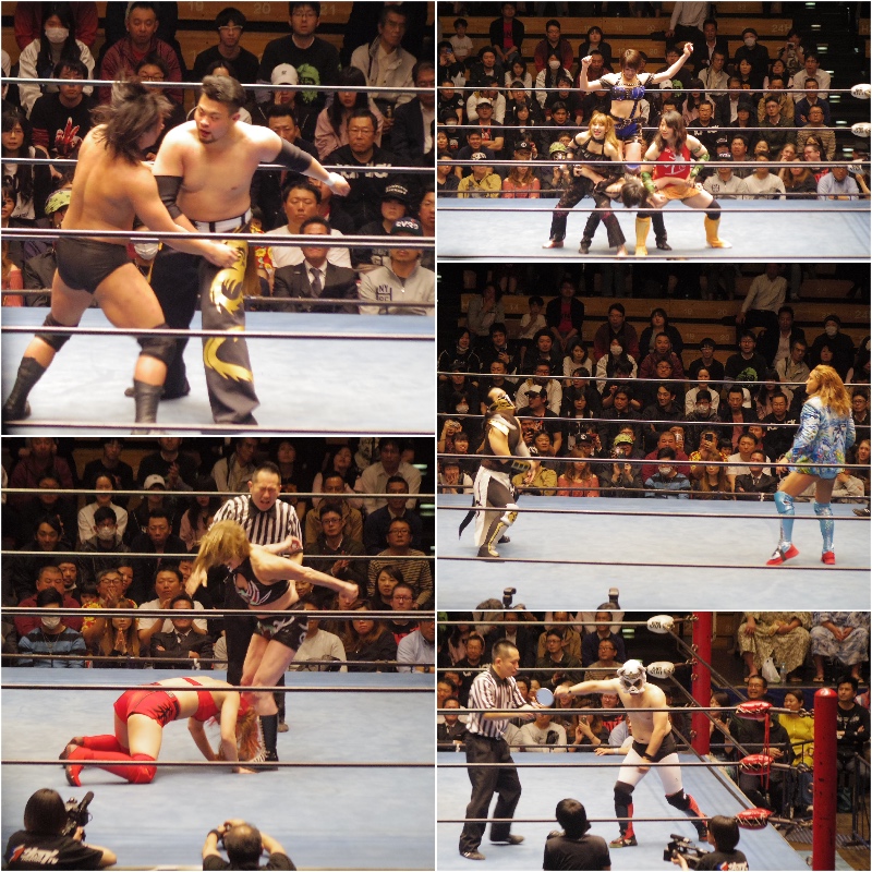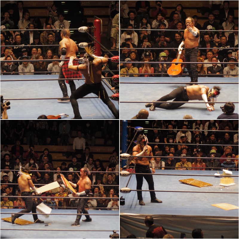 新人2人デビュー。下田の試合なんて何年ぶりに見ただろう…「コノヤロー」に全女を見た。DOUKIは佇まいもムーブもすばらしかった。エル・チャンゴ・ハポネスは誰だったんだろ。みちのくの誰かかな。デスぺは特製マスクでやってきて、ギターと有刺鉄線ボードを持参。のっけから竹串刺さる。例によって二度のノーコンテスト。デスぺはマイクで喋るが口がフガフガ…ちょっと引く…(顎骨折だったそうで)メインは両選手の思い入れが感じられる。終了後の締め、TAKAが「TT」で締めようというと場内は「TT兄弟」のことだと思って盛り上がるがTAKAはそれ知らなかったようで、偶然らしい。