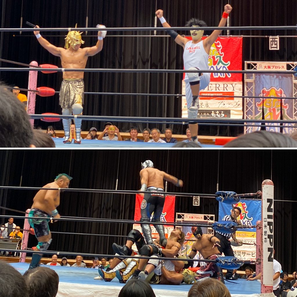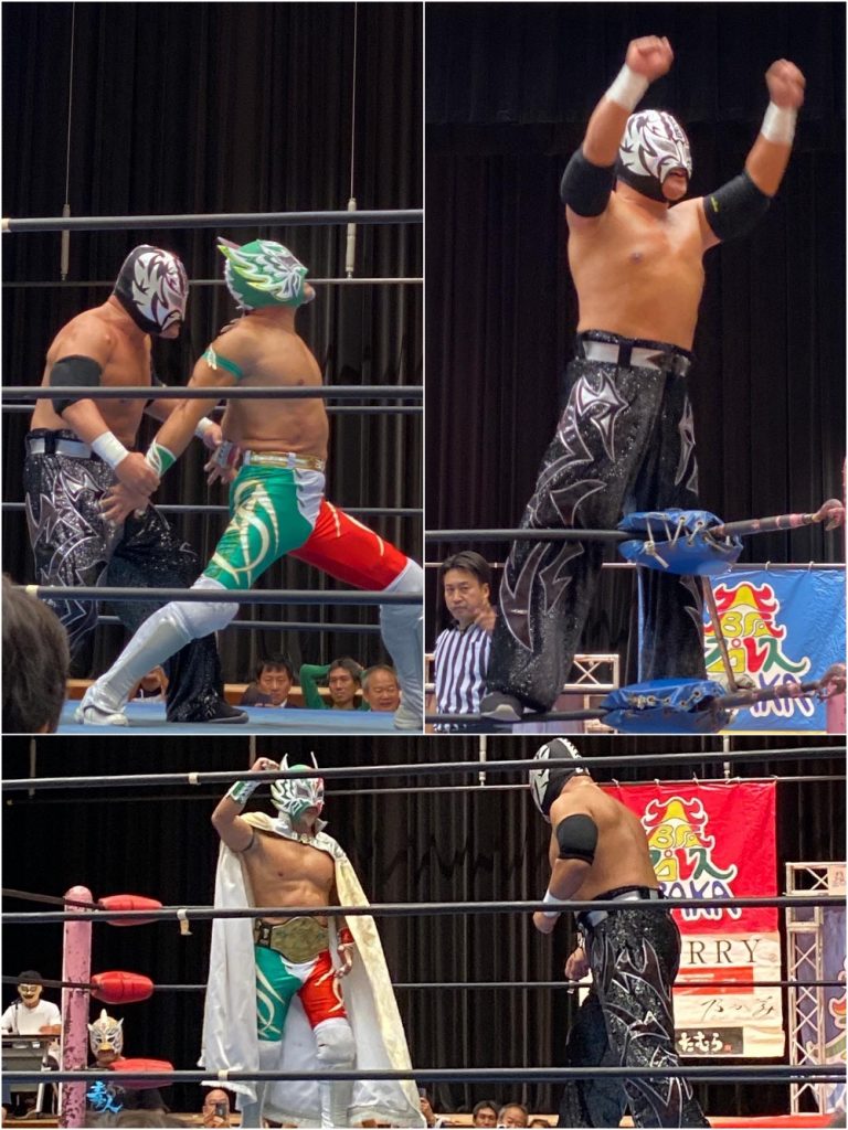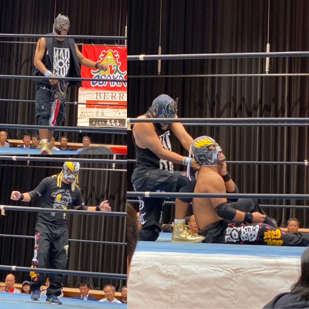 大阪プロレスだよ全員集合!2019 Pro-Wrestling 2019.10.272019.11.04 10/26 東成区民センター。図書館の上にあるとてもきれいなホール。GAMMAが「現場監督」と呼ばれていた。そんなこともあってかドラゲー勢も参戦しているのだった。こんなことになってるとは知らなかった。リングアナが風邪のため(!) 各選手が本部席でリングアナを務める。問題龍も! タコヤキーダーは今昔ほどお笑いキャラ一辺倒ではなくなっていた メインはツバサvs岸和田。岸和田兄さん、でかい声出しながら地味な技だけでつないでいくし、興行の最後まで判定に不服を言っているし、昔気質のレスラー。