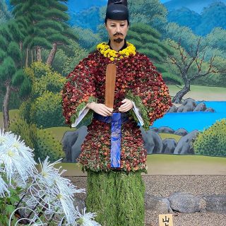 目を引くのは、武者人形のよろいをキクの花であしらった菊人形。合戦に臨んだ菊池武光が血の付いた刀を河川で洗った「太刀洗いの場」などを再現した。