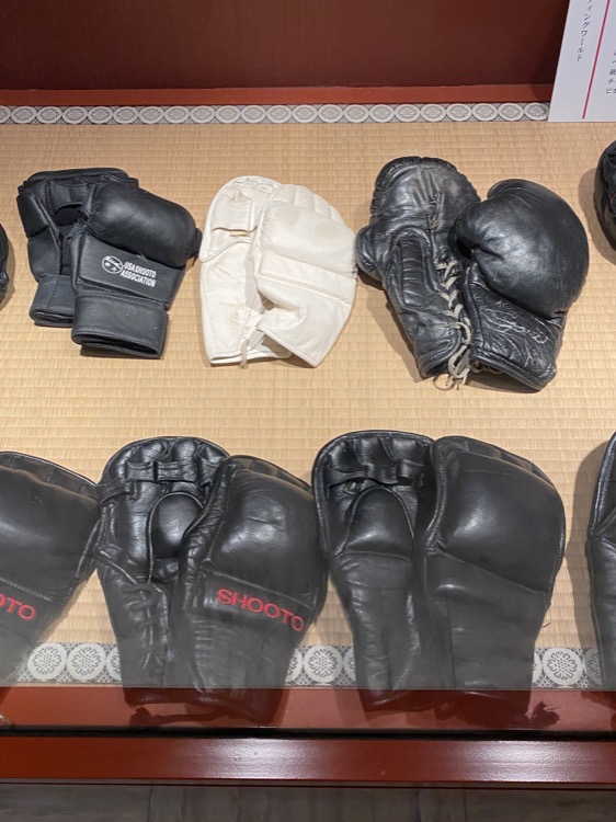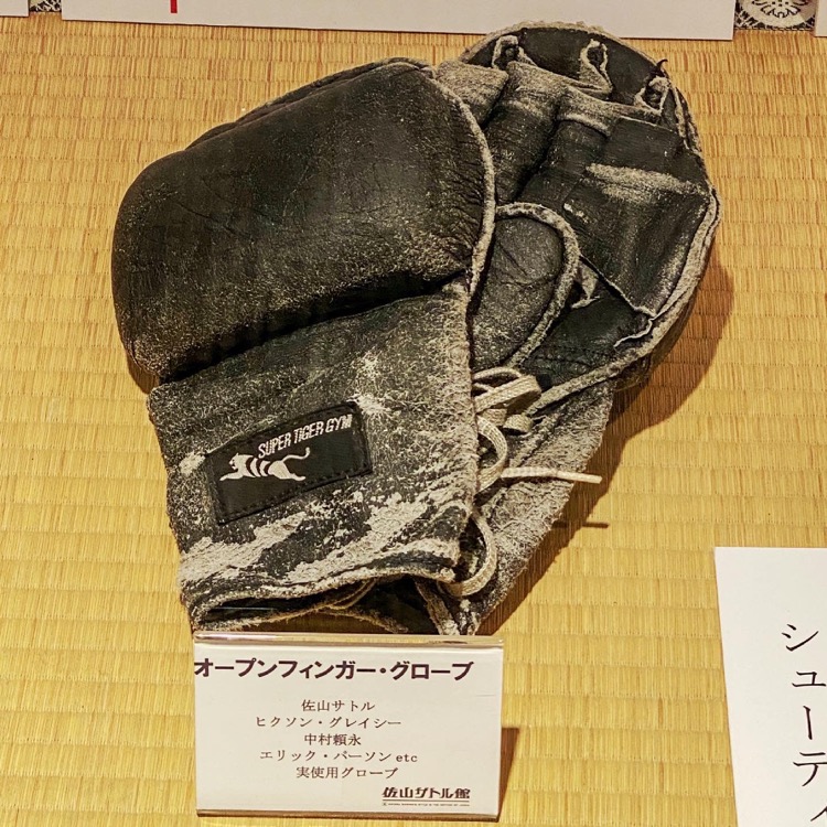 これもほぼ最古と言って良いかもしれないスーパータイガージムのロゴ入りオープンフィンガーグローブ。今のMMAで普通に使われているギアの原点。本当の最初は1977年の猪木が着用したやつだけど。