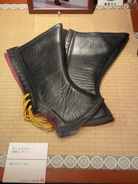 展示のレア度という意味では、ザ・タイガーのレガース。これ、おそらくプロレス界における最初の(もしくはそれに限りなく近い)レガースなんじゃないだろうか。レガースはもともと佐山と山崎一夫で試行錯誤して作ったらしいので。