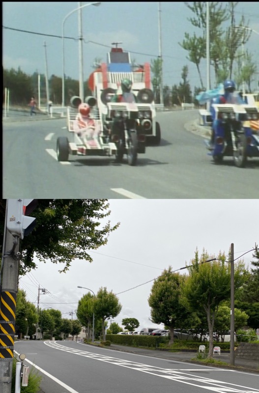 56話、伊東のホテル秀水園。唐突に黒十字総統が八名信夫に変わる。それに伴い総統のキャラも急にクドくなる。ラストのゴレンジャーとバリタンクが走るシーンで子供が2人歩道で追っかけているのが見えて、映画の「仮面ライダー対ショッカー」のエンドロールを思い起こさせる。このシーンの場所は今もみの木台クリニックがあるあたり。今みたいに住宅地もすすきの第2団地も無い頃なのですすき野団地か虹ヶ丘団地の子供が目ざとく見つけて追っかけてきたのかなと。