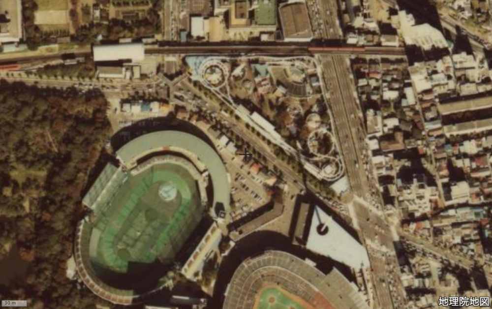 ドームのところはまだ競輪場である。講道館から丸ノ内線を挟んで向かい側に劇場があるのがわかる。今はラクーアの店舗があるところ。