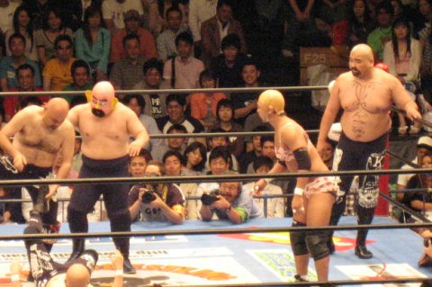荒谷どんもスキンヘッドにして(!)参加するものの、もはや誰だかわからない。でも久々に神無月に向けて(!)ムーンソルトやってたな、荒谷どん。まだちゃんとできるんだな。