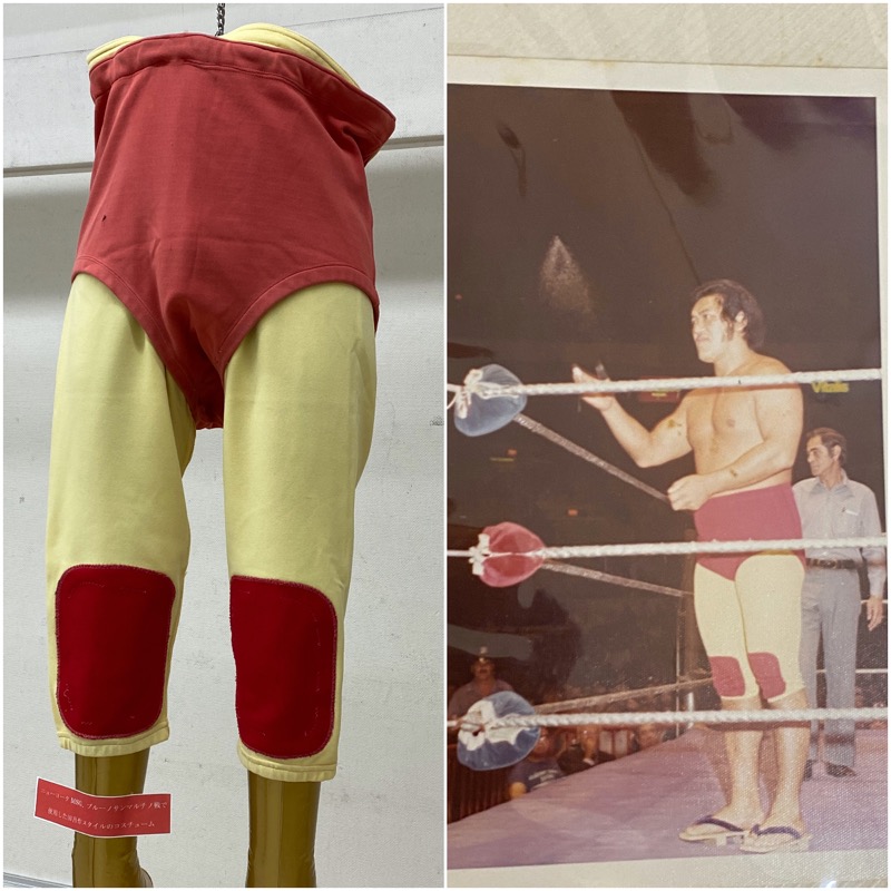 WWWF(現在のWWE)に上がっていた頃に履いていた田吾作タイツもあった。田吾作タイツといっても昭和プロレスファンしかわからないかもしれないが、’80年代くらいまで日本人レスラーはアメリカに行くと大概このスタイルのタイツを履いていたのだった。膝当ての部分の縫いがずいぶん荒っぽかった。自分で作ったのだろうか?