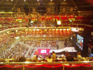 場内半分くらいつぶしてある。端だとスクリーンが見えないという、またずいぶんな感じ。