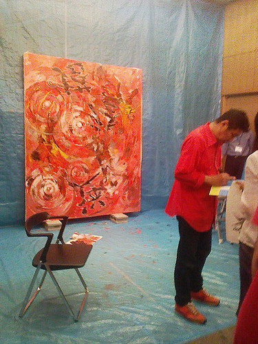 今日は横尾忠則御大が一室で公開制作をやっていた。会期中2回目なんだけど、今回は急遽本人の希望で行ったらしい。朝から。