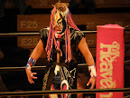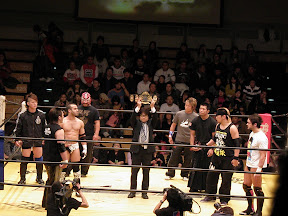 メイン、通路奥では小林邦明氏も見ていた。日高勝利で、サンジェイ・ダットが返上したベルトも合わせてゲット。願い事は「フナキサーンとタッグで組みたい。」だった。