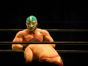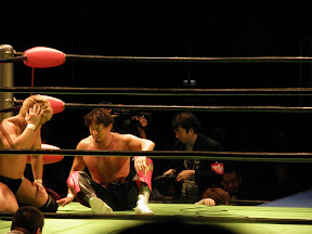 鼓太郎vsムシキングテリーは、途中で膝をやってしまった鼓太郎が動けなくなり、無理くり続けようとしたものの結局レフェリーストップ。テリーは収拾つけようとしたのか、トップロープから飛ぼうとしたが、そのタイミングで止められた。レフェリーはちょっと止めるの遅かったんじゃないかな。アクシデントがなければ何か展開があったんだろうか。