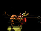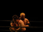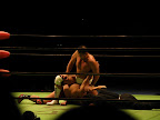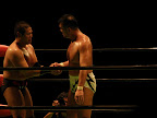 松永の引退試合。彰俊は負傷してたと思ったんだが頑張って出てきたんだな…松永はキバ付き。序盤は二人のルーツである空手の蹴りと突き。松永は凶器攻撃とキバ攻撃でペースを奪おうとするが最後はスイクルデスに沈む。