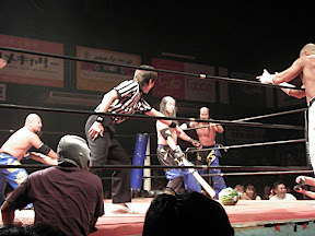 セミ、サスケ,人生,沼二郎vs佐藤兄弟,野橋は案の定メチャクチャな展開。シャッターが上がると会場の外で試合が始まっていた。シャッター上げ下げ攻撃など。