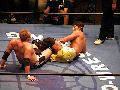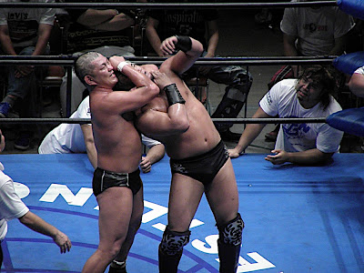 みのるは首を、諏訪魔は足をひたすら攻め続けるというゴツゴツした展開。中盤のフェースロック→STF→羽根折り固めという流れとか、みのる素晴らしい。諏訪魔も引くところは全くなくその展開についてくる。