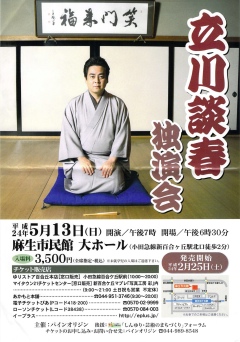 最後の挨拶では談志のことに触れる。麻生市民館は談志が去年の3月に最後の高座に上がった場所。談春は「談志終焉の地」という表現をしていたけども。責任ということを考えるようになったと。今は自分たちの死後50年落語をもたせるためには、と考えている、と。