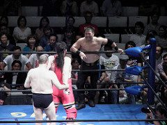 試合後もドーリングに襲われる。KENSOマイクのあとにか細い声で殊勝な挨拶。リングに上がるのは最初で最後、裏方としてバックアップしていく、というような。場内は概ね好意的な反応。みそぎが済んだかのようであった。。。このあとさらに休憩時間。