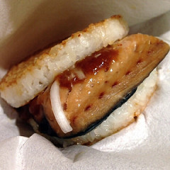 モスライスバーガー “さば味噌 骨までやわらか仕込み” Foods 2013.10.29 モスライスバーガー スペシャルページ | MOS BURGER 本日発売の新しいライスバーガー。 サバ本体にネギが少し載っている。 サバは皮付き。個人的には好印象でありまふ。