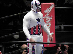 (L)ドラダのパートナーは、今年新日に突然あらわれたエル・デスペラード。 (R)ボラドール・ジュニア今日はキャプテン・アメリカ。南側階段でダイブ。メキシコでは素顔、今日も試合後にはマスク取ってた。