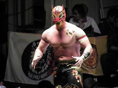 (R)マスクのほうがストゥーカJr. 素顔のほうがレイ・コメタ。対戦相手OKUMURAはメヒコ定着10年とはすごい。下田美馬も顔面にキック入れられてました。