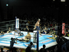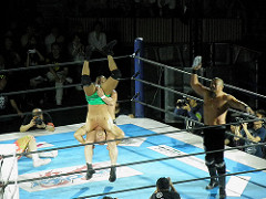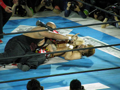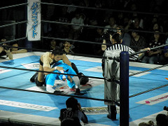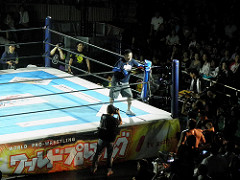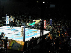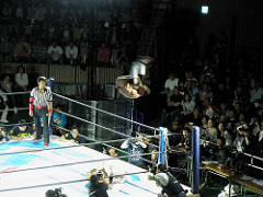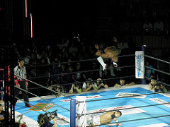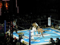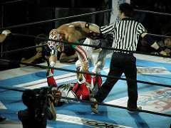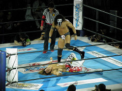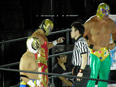第一試合。マスカラ・ドン登場。目測を誤ったミサイルキック以外はw大体いつもの中の人。ライガーはタッチして出てきて風車式バックブリーカーやって、その後すぐ「水曜日のダウンタウン」でホットな技となったw ロメロスペシャル。見せ場 早いww 顔見せ的な試合だったからマスカラ・ドラダもあまり見せ場なく。。第二試合、外道にかけたデスペラードのヘッドシザースで若干場内ざわつく。難しいもんだねぇ。外道、ロッキー・ロメロ組には欠場のコズロフがセコンドで。
