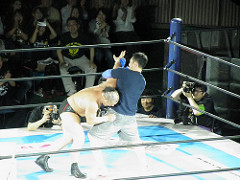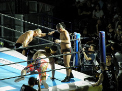 キャプテンは柴田と絡むときだけアマレスムーブを見せる。今日はレスリング時代にも出ていた代々木第二だからちょっと気合入ってたかも?永田さんと柴田は試合後も張り手の応酬。