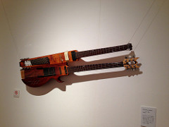 右側のダブルネック(これをメインで使っていたらしい)、上のギターはこれまた中央にブリッジ、左右にフレット。下のギターはサウスポーの弦の張り方。