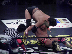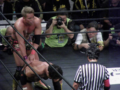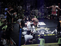 コーナーポストの力を借りてのパワーボムは途中でグリップを外したのか外れちゃったのかは不明だが、かなり危険な角度でオカダが落ちる。