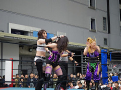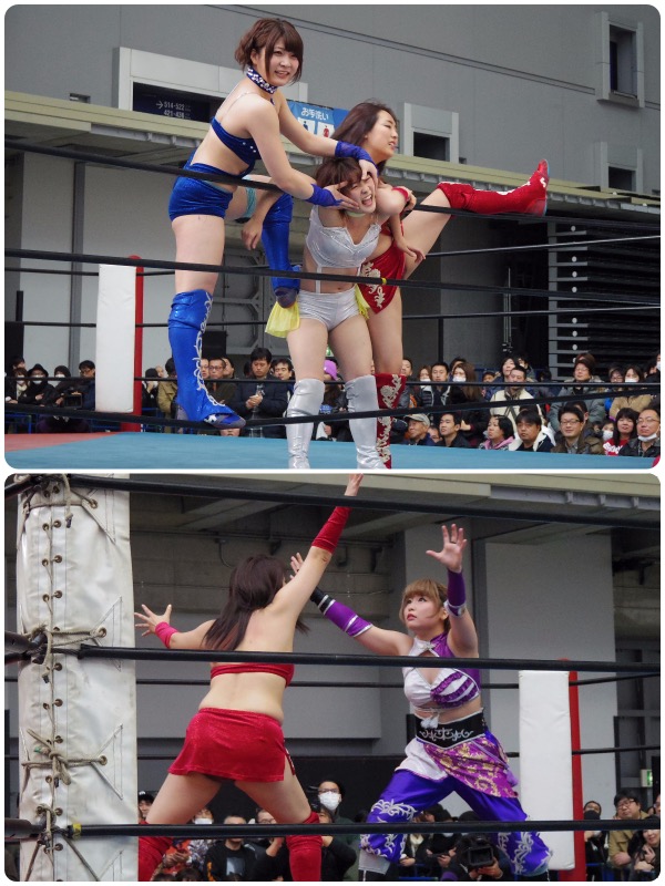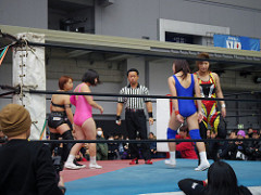 アイスリボン提供試合 藤本つかさ&つくし vs. 世羅りさ&雪妃真矢。なんと試合後に雪妃真矢が歌う。なかなかハードな..