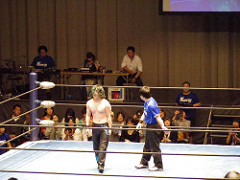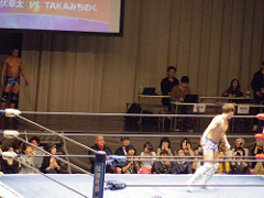 飯伏幸太vsTAKA。飯伏は今年国内2戦目だそうで。入場は「27」(やっぱりこれがいいねー)。ハサミを持ってw (かつて酔っ払ってTAKAの前髪を切ったアレ)。