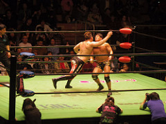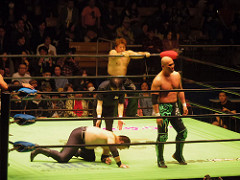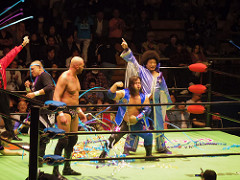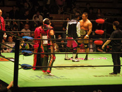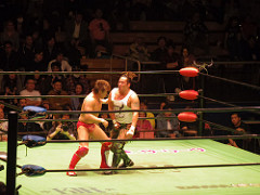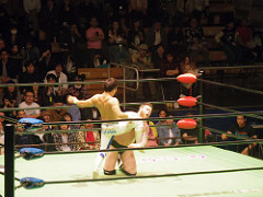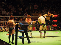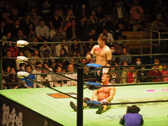 たぶん初めて見た清宮海斗。潮崎が場外でずーっとダウンしてる間に受けて受けて最後に潮崎につなぐ、だったんだけど、役割逆でもいいんじゃないのと思った。