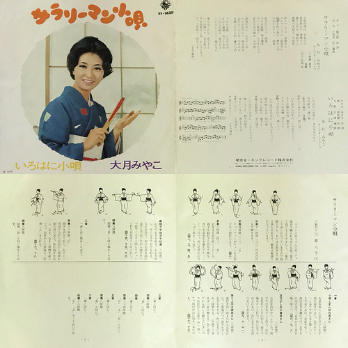 サラリーマン小唄 / 大月みやこ Music 2018.06.092019.06.17 1972年。 「サラリーマン小唄」は三味線と尺八も入ってる。イントロにドドンパのリズム。小唄のドドンパアレンジって当時はよくあったのかな。 歌詞はああ、終身雇用だねーという遠い昔の世界。 「いろはに小唄」の方は1番から4番まで「いろはの○の字に○の字をつけて」で色恋を歌う。ギターがワウっぽいっていうんだろうか、ちょっといい感じ。