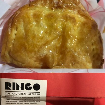 焼きたてカスタードアップルパイ専門店 RINGO日比谷で。売っているのはこの一品のみ。ディスプレイの仕方、パッケージング格好良い。
